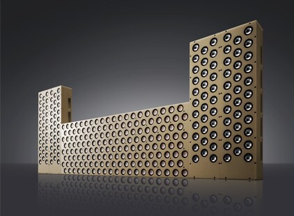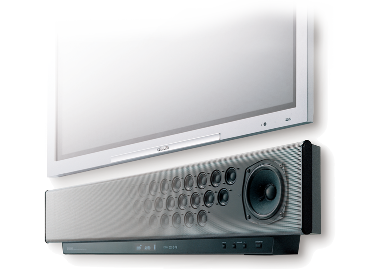 With the spread of DVDs recorded in 5.1ch surround sound, the mid-1990s saw an upsurge in the home theater market. But at the same time building a home theater required the installation of numerous speakers and the annoyance of extensive wiring. Yamaha said, “Let’s see whether we can develop a system than can produce surround sound using only front speakers,” and began a research project aimed at achieving this goal. After 2000, when flat-screen TVs became popular, their very thinness meant that YSP units had to be slimmer. Speakers typically produce sound using resonance within the housing in which they are encased. Just making the speakers thinner means sufficient resonance cannot be obtained, resulting in decreased volume and sound quality. In autumn of 2001, Yamaha came up with the solution of using a large number of small speakers to preserve volume while meeting the constraints of a thinner unit body.