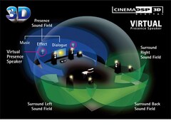 CINEMA DSP 3D provides a wide, high and dense sound field. HD Audio format decoding lets you enjoy HD Audio sources. Virtual Presence Speaker delivers 3-dimensional sound without actual use of presence speakers.