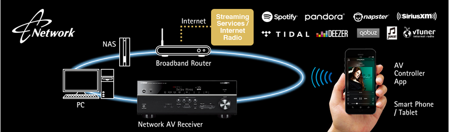 This AV receiver provides a variety of network functions that enable you to access more sources and also enhance operation. You can connect the receiver to your home network or internet to enjoy Internet Radio, Spotify*, Pandora®*, Napster®*, SiriusXM*, Tidal*, Deezer*, Qobuz*, JUKE* or music stored on a NAS and home PC. The AV Controller app (from iTunes® App Store or Google play) lets you control various functions from your iPod®, iPhone®, iPad® or Android™ phones / tablets.