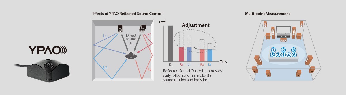 YPAO-R.S.C. analyses room acoustics and measures various speaker characteristics, then calibrates audio parameters to achieve optimum sound at any of eight listening positions. It uses 64-bit precision EQ calculation to achieve the most natural room acoustics possible and Reflected Sound Control to correct early reflections for studio-quality sound. It also provides DSP Effect Normalisation, which varies the CINEMA DSP parameters according to the reflected sounds.