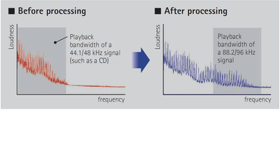 Hi-bit high-sampling extension up to 96 kHz / 24-bit can be applied to lossless 44.1 / 48 kHz content such as from a CD (2-channel PCM) or a FLAC file for further heightening of the musicality in the original content.