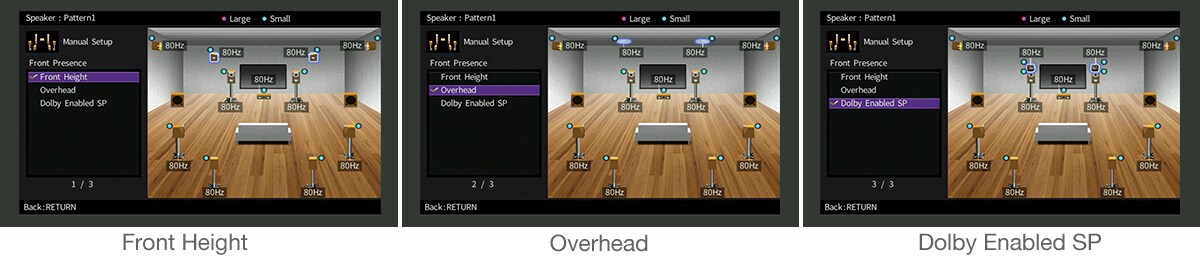 Yamaha provide multiple placement patterns for presence speakers that support Dolby Atmos, creating a sound field that’s ideal for your setup. Any layout can be appropriately reproduced, including the three-dimensional space of CINEMA DSP as well as Dolby Atmos.