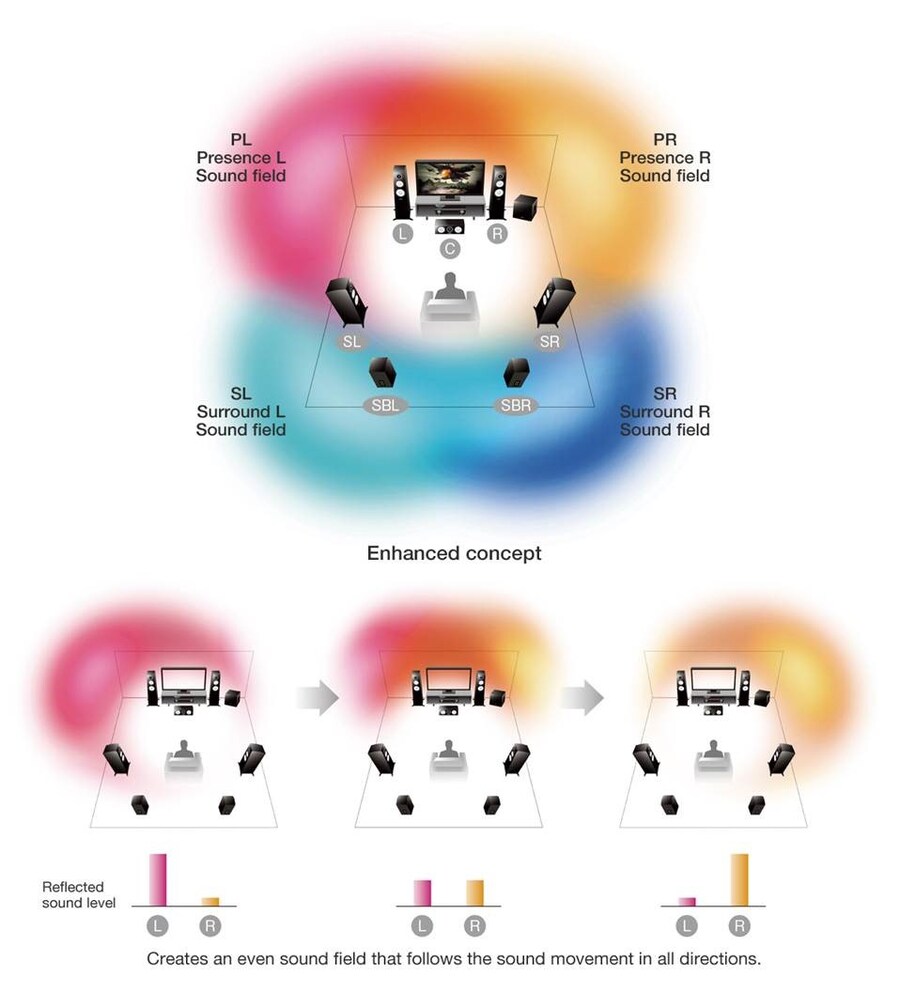 Even when it is impossible to install surround speakers behind the listening position, Virtual CINEMA DSP reproduces virtual 7-channel surround sound filled with realism, from only two front speakers. The Virtual CINEMA FRONT feature lets you place two surround speakers and a centre speaker at the front to enjoy virtual 7-channel surround sound with even higher quality and resolution, as well as superior rear virtual sound localisation. Adding two additional front presence speakers provides a three-dimensional sound field that gives you a feeling of its height and depth and of the vertical movement of the sound. You get more flexibility to arrange your speakers inside the room, along with easy enjoyment of high quality surround sound.