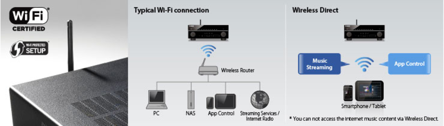Wi-Fi Built-in capability allows wireless connection with your household wireless router, greatly simplifying system connections to enjoy network audio and music streaming services. If no Wi-Fi router is available, the unique Wireless Direct feature not only allows you to stream music directly from your smartphone or tablet via AV Controller App's Music Play feature, iOS's AirPlay® etc, but also control your receiver using the AV Controller app.