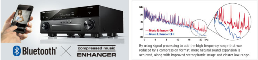 This AV receiver is equipped with Bluetooth functionality to let you enjoy easy wireless music playback from smartphones and other devices. Yamaha Compressed Music Enhancer is now optimised for Bluetooth audio transmission to ensure that your music will have vivid, lively sound quality even during wireless playback.
