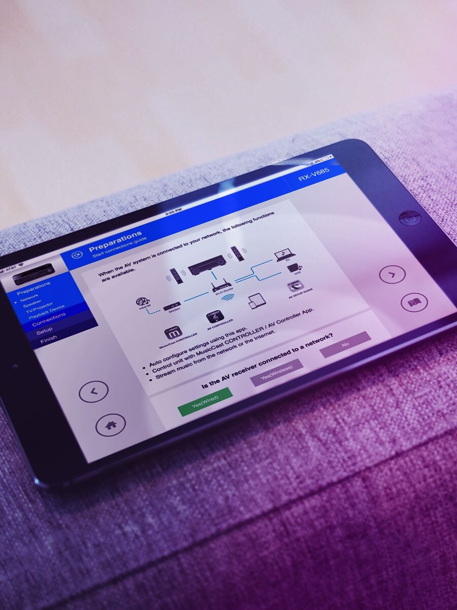 Tidak khawatir, tidak bingung. Gunakan aplikasi khusus ini dan dapatkan bantuan dari pakar dengan koneksi kabel antara AV receiver dan perangkat sumber. Aplikasi ini bahkan akan memandu Anda dalam melakukan berbagai pengaturan seperti koneksi speaker, TV, dan koneksi perangkat sumber serta penetapan power amplifier.