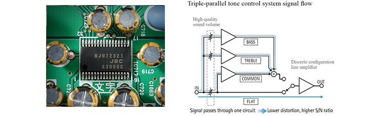 We’ve utilised a high-quality digital volume control specially designed by New Japan Radio Co., Ltd., which consists only of adder-type resistance, removing the impact of slew-rate decline or colouring of the sound, delivering higher purity in the sound, and excellent, fast response to large volume changes and steep transients. Moreover, the tone controls employ a triple-parallel method, minimising the detrimental impact on sound quality seen with straight-line tone controls. In addition, the bass, treble, and common circuits each utilise simple construction in which the NFB of the amp is not used and the CR elements are simply fixed in a straight line, ensuring exceptionally pure sound reproduction even when tone control is applied and superb response to audio signal transients. When tone defeat is applied, straight signal flow from only one volume circuit to a discrete configuration buffer amp is realised.