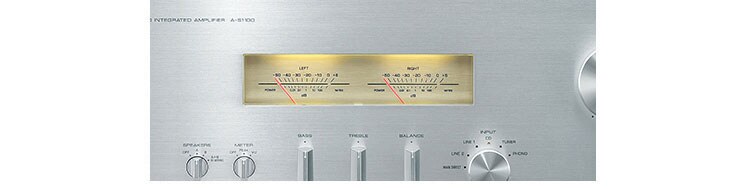 The centre of the main unit features level meters that provide visual enjoyment of the music as well, with the rapid and delicate movement of the needles. The meter is illuminated softly from inside by LED, giving a warm, beautiful lamplight look. The meter indicators can, along with VU display, be switched to peak display, and can be selected according to your preferences. The window of the meters has been precision-fit to the panel—completely flat, with no gaps—for an elegantly beautiful appearance.