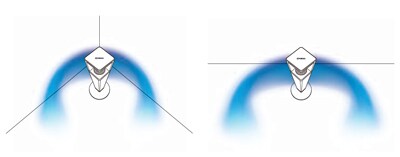 angled at 45-degrees to the left and right to reflect sound off the walls. A third speaker in the top of the unit results
