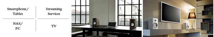 All-in-one bookshelf HiFi monitor speaker featuring an amplifier equipped with network functionality. Enjoy the best in sound whether from smartphone, streaming services, PC, NAS or TV audio.