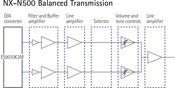 In principle, balanced transmission cancels the external noise that becomes mixed with the signal during transmission. In the NX-N500, all digital audio input signals undergo balance conversion in the L-channel speaker before being transmitted to the R-channel speaker. XLR cable is used to establish balanced connection between speakers. This approach thoroughly eliminates noise.
