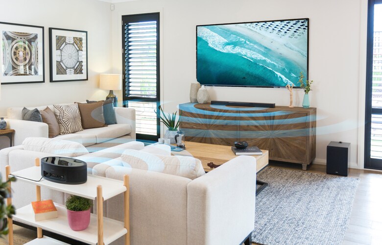 - Hubungkan ke TV untuk suara yang ditingkatkan
