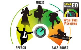- 1-Knob Master EQ™ dengan bass boost virtual