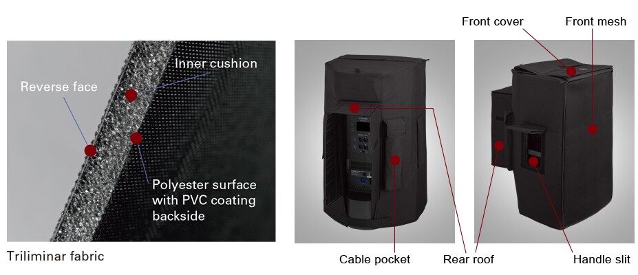 The functional speaker covers that protect your speakers from unfavorable weather conditions during outdoor performances, dusty and dirty warehouse storage, or the rigors of equipment transport on the road.- Trilaminar fabric of durable polyester, with inner PVC coat and cushion inside for impact suppression.- Front mesh allows sound reinforcement with the cover as well as ensures amp cooling.- Rear roof allows easy access to the rear panel with the cover on.- Handle slit allows easy access to the handles for carriage- Inner pocket additional space for carrying cables.*NOTE: The covers do NOT guarantee water-drip protection.