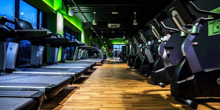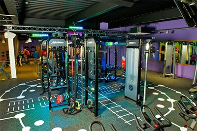 The system comprises 12 VXS8 wall-mounted loudspeakers and eight VXC6 ceiling speakers, powered by two XMV4140 amplifiers, with routing and signal processing from an MTX3 digital matrix mixer. It is used for general background music throughout the gym and is split into five zones, which are remote controlled via DCP4V4S and DCP1V4S wall-mounted units. Two inputs are used, one from a SoundJack music subscription service, the other from a ShowCAD-based computer running videos in conjunction with a Life Fitness Synrgy360 equipment system.