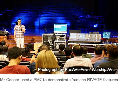 Setelah penjelasan yang singkat tetapi menghibur tentang sejarah mixer Yamaha sejak awal 1970-an, Andy Cooper, manajer pro audio keteknikan aplikasi dari pusat R&D Yamaha di London, menggunakan PM7 tambahan untuk menjelaskan antarmuka dan fitur sistem mixing digital Rivage, termasuk menunjukkan plugin seperti filter dan kompresor Rupert Neve dengan memutar sampel suara. Setelah itu, Tn. Cooper menguraikan kemampuan audio digital dan jaringan kontrol pada jajaran produk PM berdasarkan Dante dan tipologi ring fiber TWINLANe milik Yamaha.