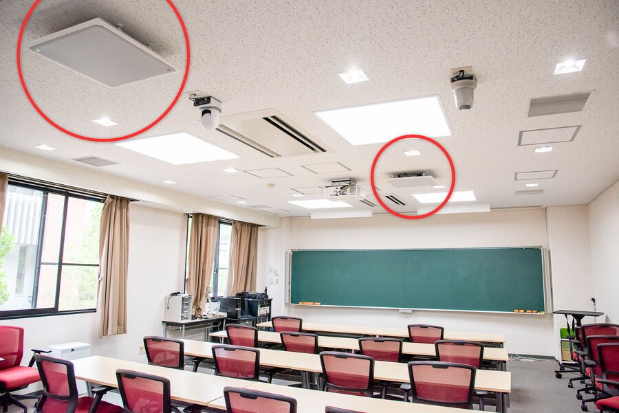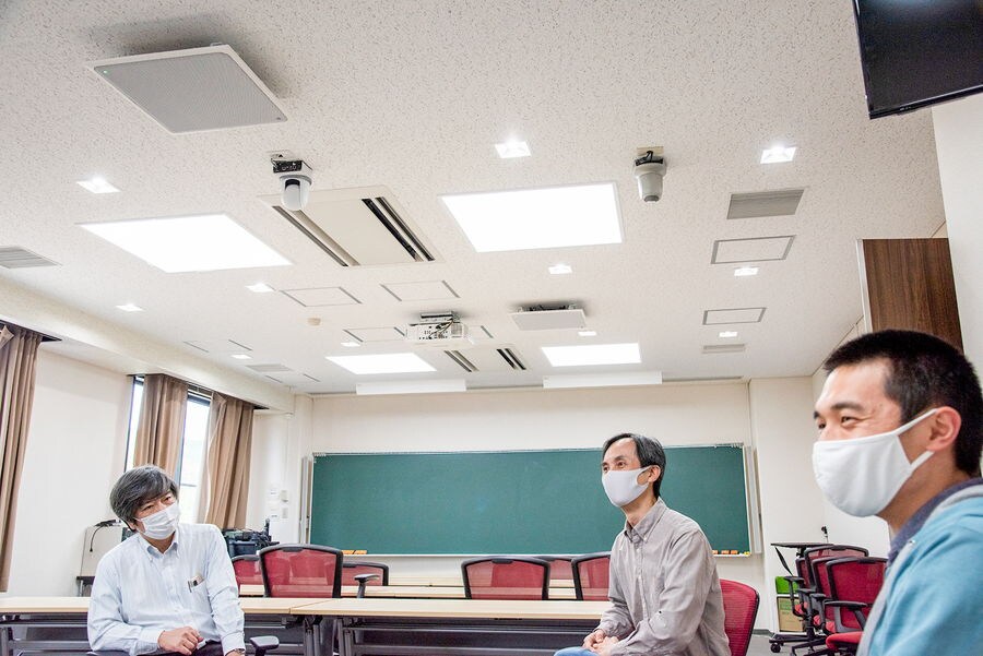 Profesor Onishi: Bagaimana pun, kami membutuhkan lebih banyak ruangan tempat kami dapat melakukan pertemuan jarak jauh akibat wabah virus corona. Tahun lalu, kami menyiapkan tiga atau empat speaker-phone Yamaha YVC-1000 dan mikrofonnya untuk melakukan pertemuan jarak jauh. Namun, saya khawatir bahwa kami perlu memasangnya setiap saat, tetapi jika kami dapat memasang mikrofon ke plafon dan menerapkan perangkat lain... Di situlah Tn. Kanno menemukan ADECIA untuk kami.
