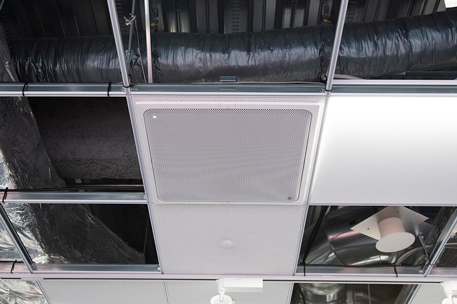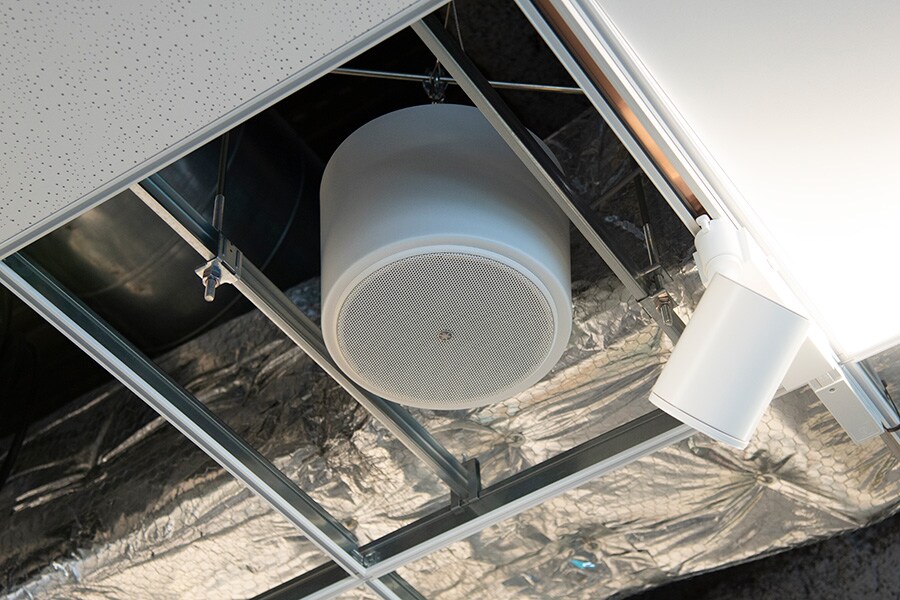Ruang Inovasi Terbuka speaker dan mikrofon ADECIA dipasang di plafon.
