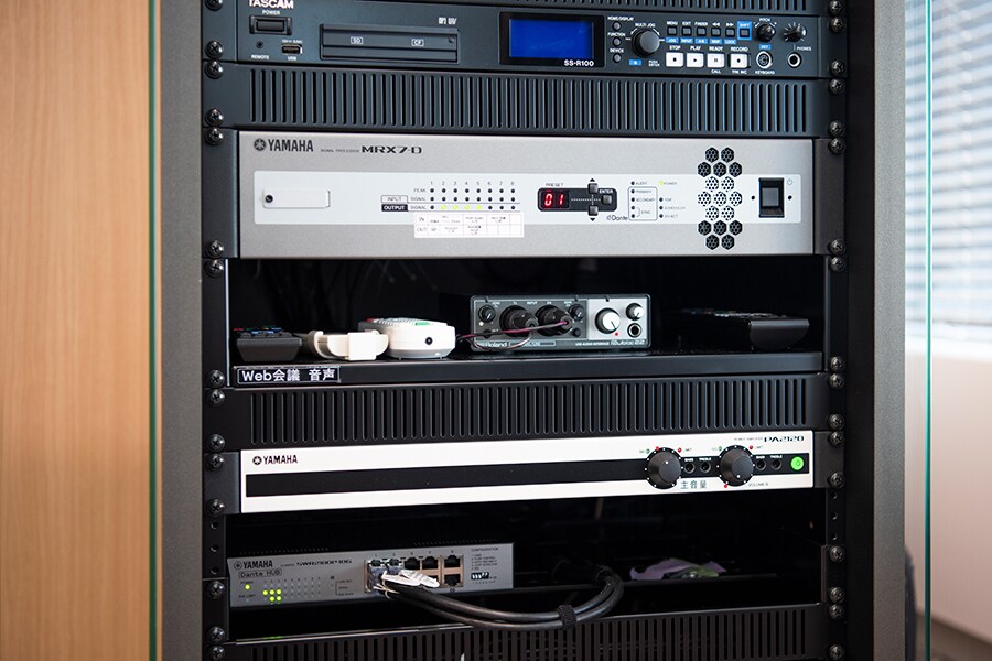 Tn. Takeyama: Mereka bukan hanya meminta sistem konferensi jarak jauh, tetapi juga amplifikasi mikrofon handheld selama pertemuan dan seminar rutin berlangsung, dan amplifikasi berbagai sumber input termasuk audio komputer yang digunakan selama presentasi dan audio Blu-ray. Karena permintaan spesifik tersebut, saya memilih untuk menggunakan prosesor sinyal "MRX7-D" karena ini adalah sistem fleksibel yang dikonfigurasi untuk mendukung aplikasi semacam itu. Khususnya saat melakukan amplifikasi menggunakan mikrofon handheld selama konferensi web berlangsung, hampir tidak mungkin untuk sepenuhnya menghilangkan gema dan feedback, sehingga fungsi echo canceller dan feedback suppresor yang terpasang pada "MRX7-D" menghindarkan stres dan memberikan lingkungan konferensi web yang nyaman.