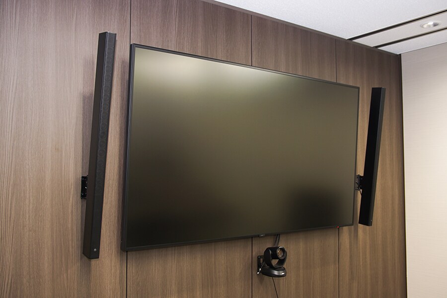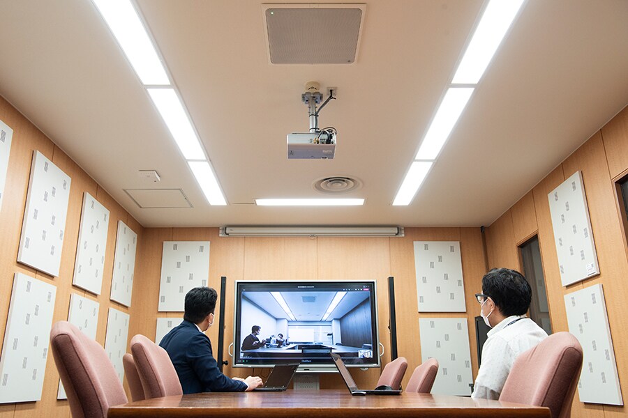Toyoura: Kami biasanya melakukan pertemuan internal dan telekonferensi dengan mitra dagang. Ini bukan ruang peragaan khusus, tetapi jika Anda menghubungi kami, Anda bisa datang dan melihat sendiri sistem yang sebenarnya di Kantor Takanawa. Seperti saat ini, Anda dapat merasakan kualitas audio dan performa "ADECIA" saat terhubung ke ruang peragaan Hakozaki dan Kantor Takanawa, dan Anda dapat terhubung dengan ruang telekonferensi pelanggan untuk merasakan performa mikrofon yang luar biasa. Selanjutnya, tone panel, yang disebut TCH, dipasang di ruang telekonferensi di Kantor Takanawa Yamaha. Panel ini hanya setebal 3 cm yang dapat dipasang untuk meningkatkan kualitas audio ruangan. Anda dapat merasakan efek ini.