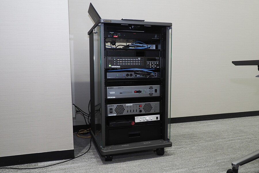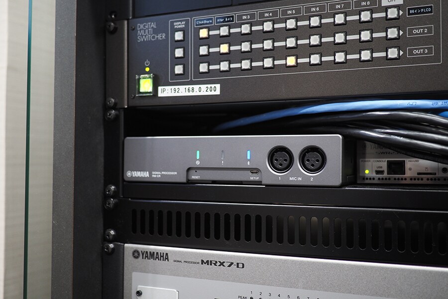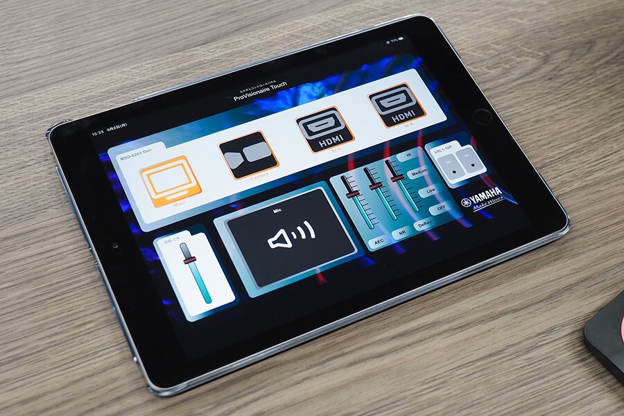 Toyoura: Prosesor ADECIA dipasang dari jarak jauh menggunakan ProVisionaire, perangkat lunak panel kontrol khusus yang memungkinkan pengendalian dan pemantauan sistem dari jarak jauh. Misalnya, jika Anda mengkonversi ke ClickShare secara nirkabel meskipun Anda tidak memiliki komputer host, iPad ini memungkinkan Anda untuk menonaktifkan mikrofon secara manual. Anda juga dapat menaikkan atau menurunkan volume speaker, atau menggunakan switch untuk beralih antar video selama melakukan pertemuan rutin. Anda juga dapat memutar atau menghentikan pemutar Blu-ray yang mendukung remote nirkabel Yamaha yang disebut MusicCast. ProVisionaire juga memiliki kelebihan karena dapat dengan bebas mendesain layar Anda dengan nuansa PowerPoint sesuai dengan aplikasi yang digunakan.