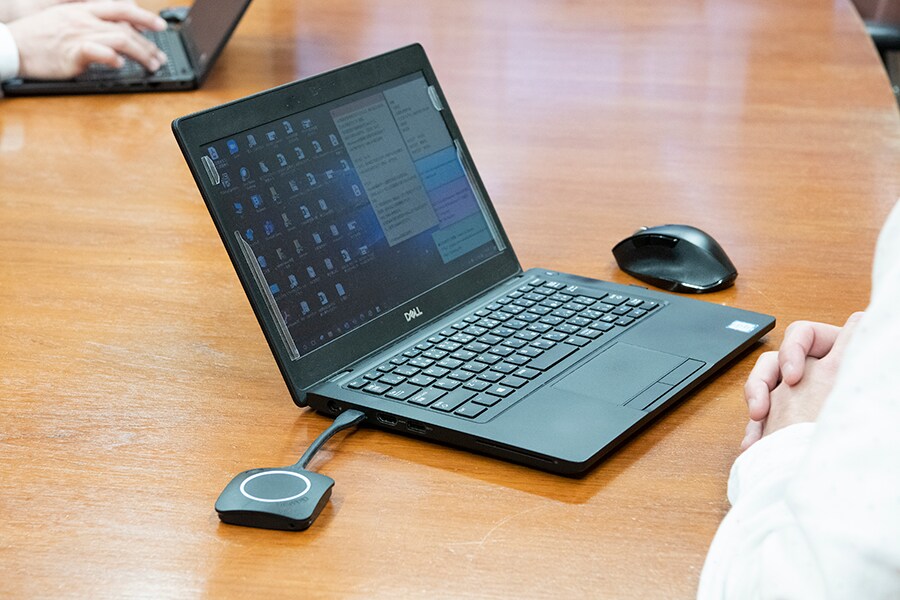 Namun, dengan ClickShare, Anda cukup menghubungkan kabel ke Unit Dasar ClickShare, lalu cukup memasukkan tombol ClickShare ke komputer Anda, sehingga Anda dapat segera melakukan telekonferensi jarak jauh menggunakan ADECIA. Pertama-tama, mikrofon ceiling ADECIA memberi keuntungan membuat meja selalu tampak rapi, jadi melalui kombinasi dengan ClickShare, Anda dapat menciptakan lingkungan telekonferensi jarak jauh nirkabel sepenuhnya di mana tidak ada kabel di atas meja sama sekali.