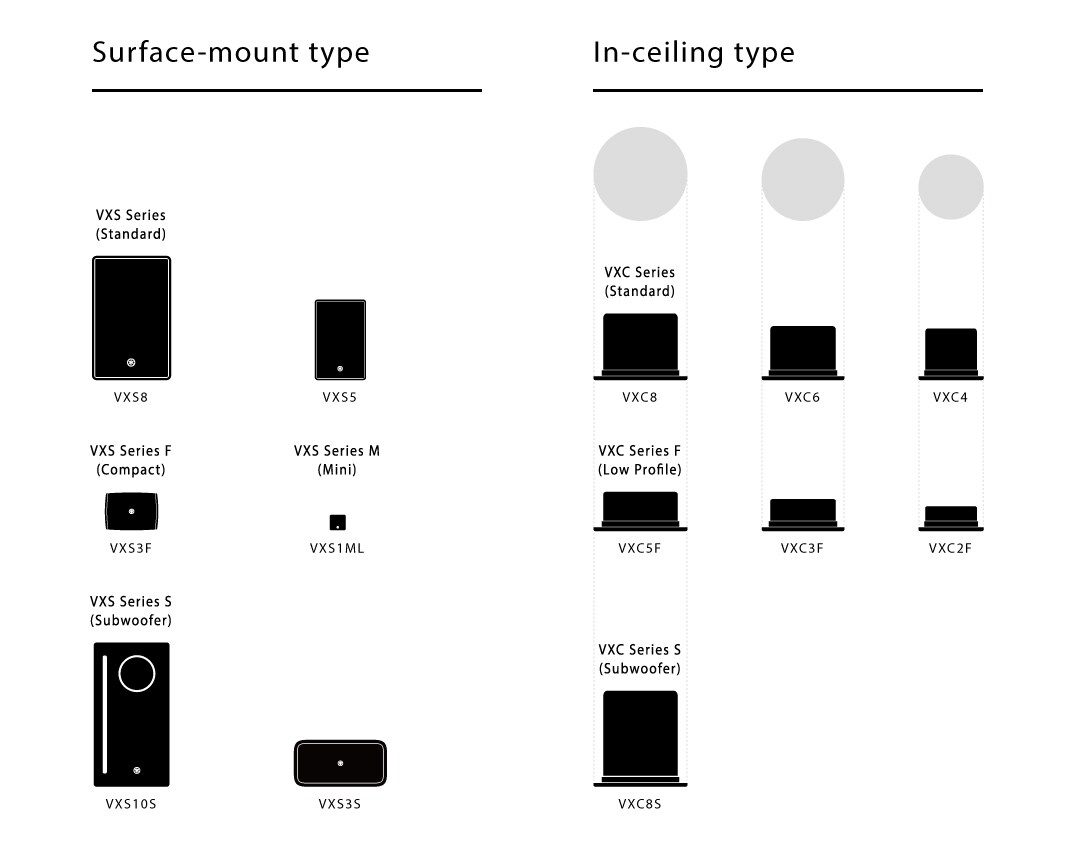 Speaker Surface MountJajaran unit VXS Series memiliki dua full range dan dua subwoofer, yang memungkinkan Anda memilih model yang optimal untuk aplikasi tertentu dan, jika perlu, mengombinasikannya dengan subwoofer untuk tempat yang memerlukan suara low yang lebih kuat.