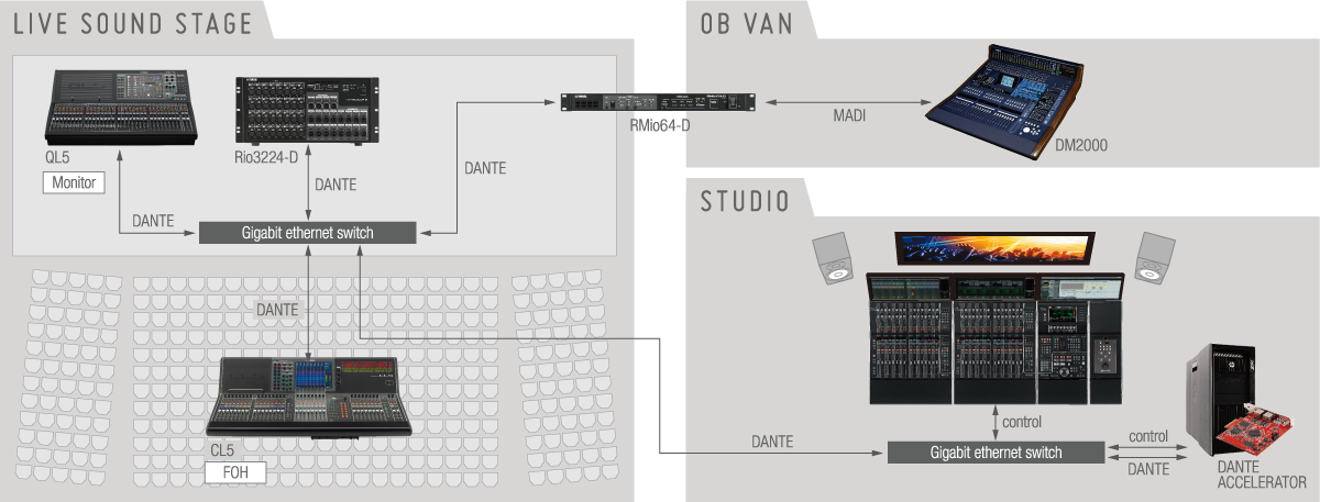 - Audio is transferred from the stage inputs to the front-of-house and monitor consoles as well as the Nuage system via the Dante network, and is converted to MADI audio for transmission to an OB van.