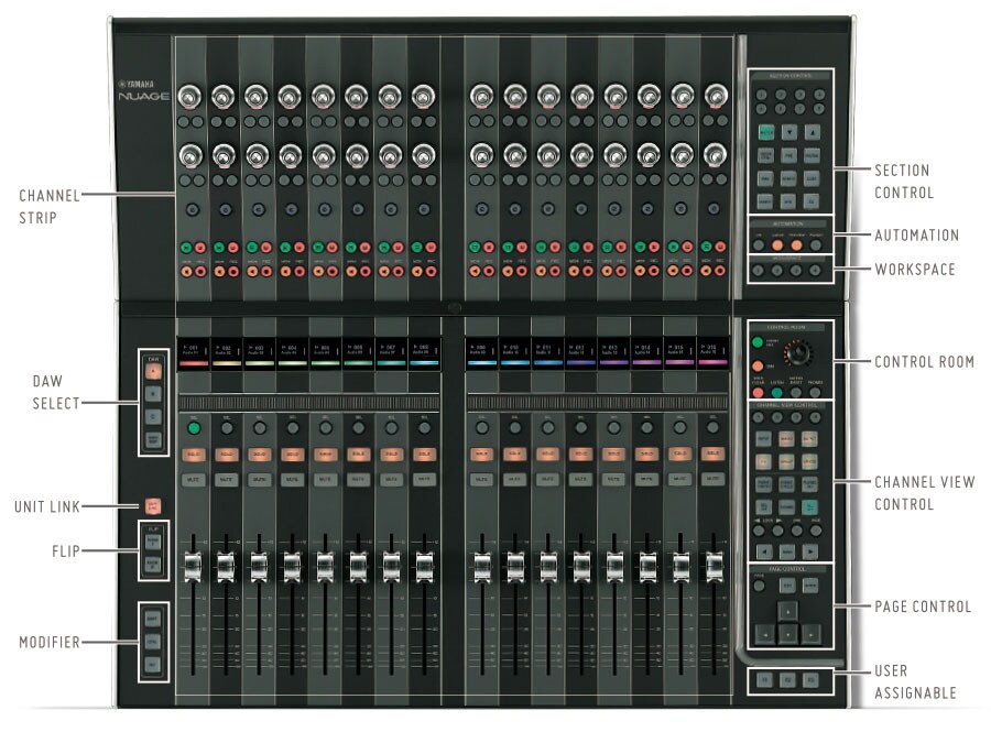The Nuage interface is comprised of Nuage Fader units, each with 16 fader and knob channels, and Nuage Master units that include all controls necessary for transport operation, editing, monitoring, and more. The units can be used individually or combined in systems configured to match the scale and workflow of different studios, with up to three Nuage Fader units per system. A UNIT LINK button allows units to be easily unlinked for two-man operation, and then linked again as necessary.