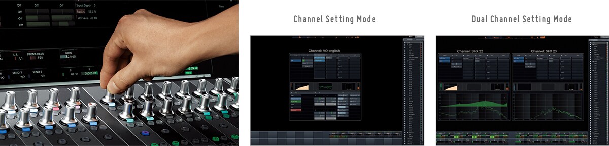 Each of the sixteen channels on the Nuage Fader unit has two touch-sensitive Multi Function Knobs. METER, PRE, ROUTING, PAN, SENDS, CUE, and other parameters can be instantly selected and operated as required. For even more comprehensive control a channel [e] button can be pressed to engage the Channel Setting Mode in which parameters for that channel can be directly controlled via all 32 of the console's Multi Function Knobs. There's also a Dual Channel Setting mode that allows two channels to be selected with parameters controlled by 16 Multi Function Knobs each. A number of other features such as three levels of control (normal, fine, and super-fine) and fader adjustment of parameters assigned to the knobs further enhance flexibility.