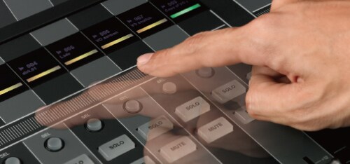 [CHANNEL STRIP] : Each channel strip has a touch-sensitive 100mm motor fader, two multi-function knobs, and a channel name/icon/color display.