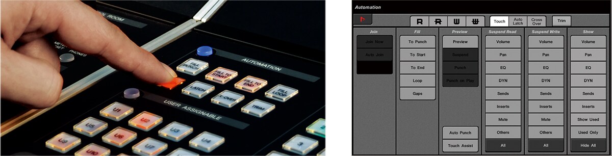 Nuage provides a complete duplicate of the Nuendo/Cubase Automation Panel where all automation settings can be managed as a group, with full access from the Nuage Master unit Multi Function Display. It is also possible to select the automation punch-out mode (Touch, Auto-latch, Cross-over) and the post punch-out behavior (Fill to Punch, Fill to Start, Fill to End) from the Nuage controls. Of course automation read and write buttons are provided on each channel strip, adding to the system's overall automation convenience and flexibility.