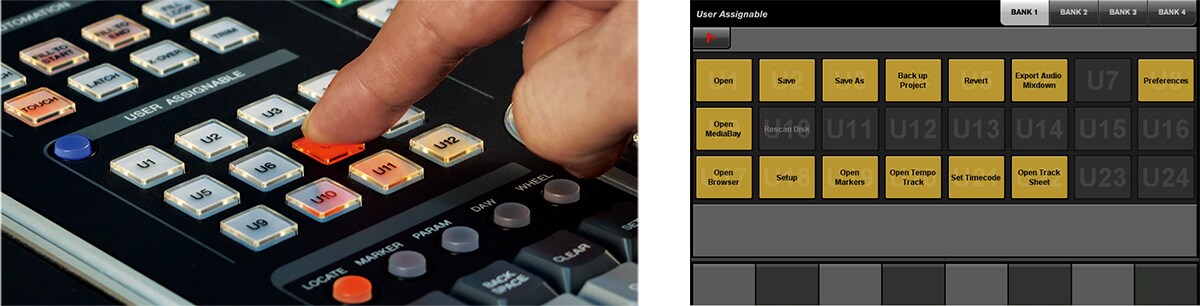 Every engineer has his or her own way of approaching the editing process, and every application presents different challenges. The Nuage Master unit features a "User Assignable Section" with controls that can be customized by the operator to provide direct access to the functions and parameters needed for the task at hand. Functions that need to be performed repeatedly, such as importing audio files, for example, can be assigned for one-button efficiency. 12 hardware user assignable buttons and 96 soft keys (24 x 4 banks) provide plenty of capacity.