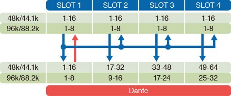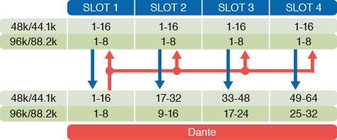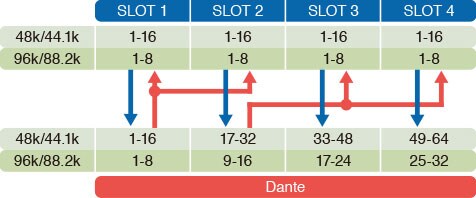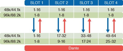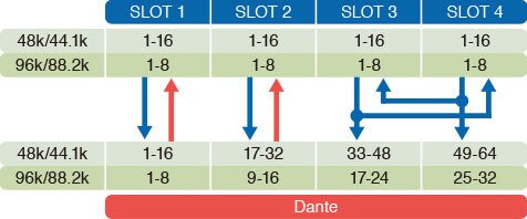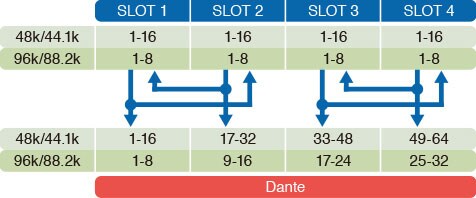 PATTERN 6: Dante inputs 1~16* to slots 1 and 2 / Dante inputs 17~32* to slots 3 and 4