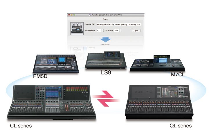Since QL and CL series mix data are compatible, data created on either type of console can be directly read and used by the other. The time and effort spent setting up mix data for one job can be carried over to other jobs. Moreover, the Yamaha Console File Converter application provides compatibility with PM5D, M7CL, and LS9 consoles as well. All the data you have carefully crafted can be put to good use in future situations.