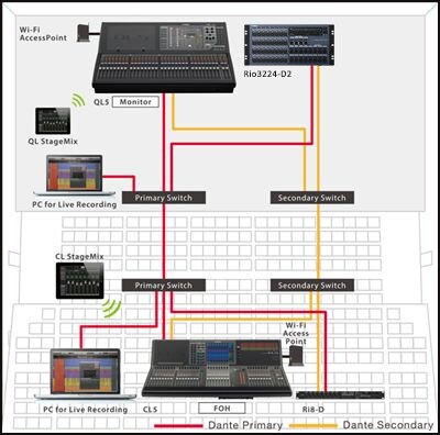 In this compact but capable live sound system a CL series console serves front—of—house while a stage side QL console doubles as monitor mixer and I/O device thanks to its Port to Port capability. The Gain Compensation function means that head amp gain can be safely controlled from either console without interference. For maximum system reliability a star network configuration with network switches is used for redundancy, so that a problem in one part ofthe network will not interrupt the overall signal flow, Live recording to multiple computers is also possible.