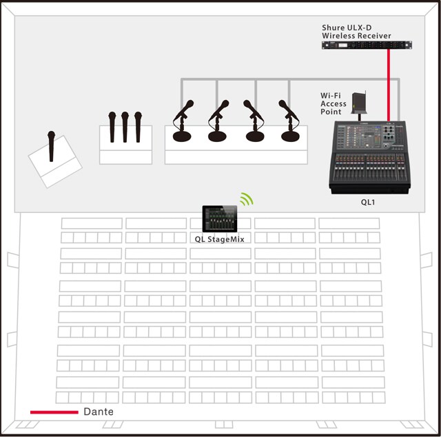 Network capability is essential in today’s live sound applications, and the QL series offers all you need. In addition to their all-in-one capabilities, QL series consoles come with the widely implemented Dante digital audio networking protocol, developed by Audinate, as a standard feature. That means the QL consoles can be combined with other Dante capable devices, such as CL series consoles and R series I/O rack units, to flexibly create systems for applications of just about any scale or complexity.
