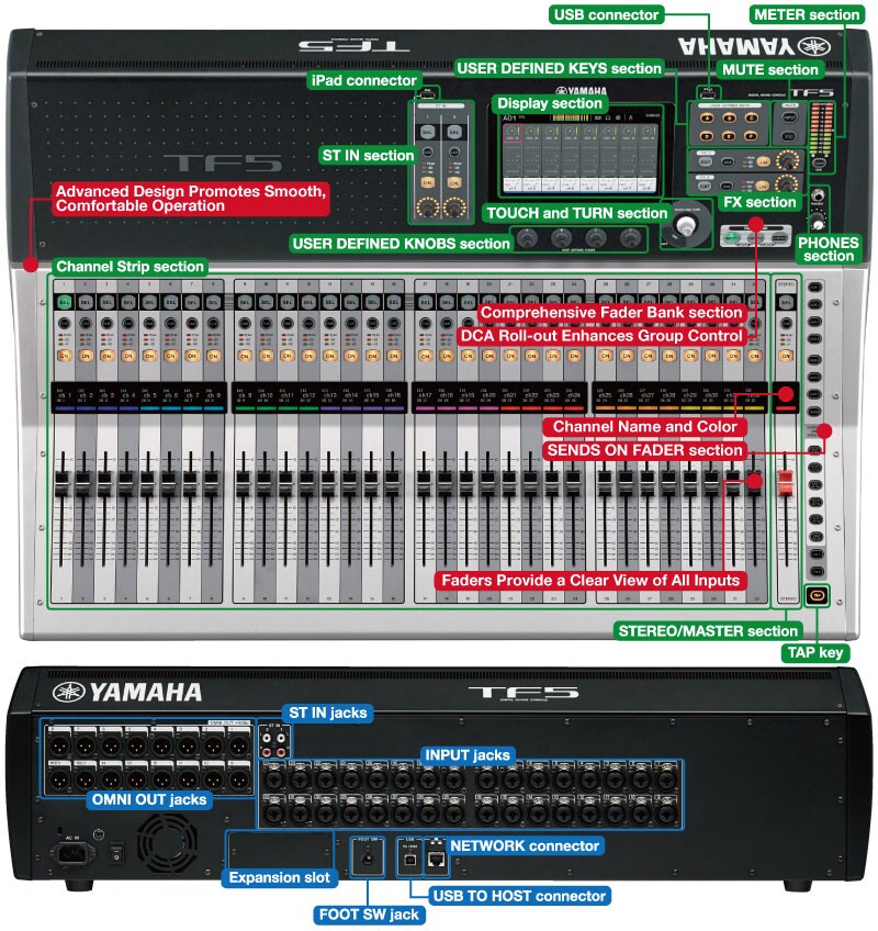 The TF5 has 33 motor faders, the TF3 has 25, and the TF1 has 17. All rear-panel inputs have individual faders so their status can be verified at a glance and they can be directly and immediately accessed for control.