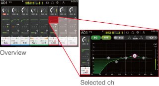 Like the CL series consoles, operation is based around Overview and Selected Channel windows. The overview display shows the parameters for eight channels at a time, while the Touch & Turn knob provides direct access to gain, 1-knob EQ™, 1-knob COMP™, gate threshold, effect send level, pan, and other parameters. Touch the highlighted parameter a second time to switch to the Selected Channel display when you need access to detailed parameters for finer control.