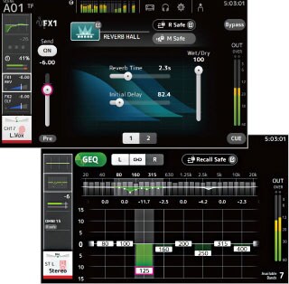 The TF series hardware is packed with features that contribute to superior operability and convenience. Faders, knobs, and buttons with outstanding fit and feel work seamlessly with state-of-the-art display technology, including high-visibility channel name and color displays. The touch panel itself offers an ideal blend of comprehensive visual feedback and fast response.The physical layout of these components brings everything together in a system that offers surprisingly efficient workflow.