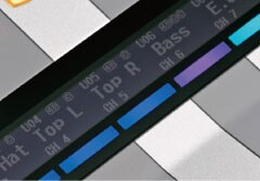 A display panel located above each channel fader shows the assigned channel name or ID, the port name, and the current fader setting. Phantom power status as well as gate and comp operation can also be displayed. A color bar that shows the assigned channel color makes visual navigation a breeze, and prevents confusion when fader banks are changed or scenes are recalled.