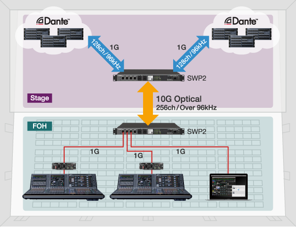 SWP2 series dilengkapi port optik uplink 10G, yang memungkinkan pengoperasian tanpa kekhawatiran kehabisan bandwidth meskipun jaringan Dante berjalan di frekuensi sampling 96 kHz. Switch ini merupakan solusi skalabel yang berkembang dengan sistem jaringan Dante 96kHz. SWP2-10MMF memiliki konektor opticalCON yang dilengkapi fiber multi-mode dan SWP2-10SMF memiliki konektor opticalCON yang dilengkapi fiber single-mode. Baik multi-mode maupun single-mode memungkinkan transmisi jarak jauh. Model MMF memungkinkan transmisi jarak jauh hingga 300 meter dan model SMF memungkinkan transmisi jarak jauh hingga 10 kilometer. SWP2 series dapat ditambahkan untuk memungkinkan dua kabel fiber optik digunakan untuk koneksi yang redundan. Spanning tree protocol (MSTP) juga didukung untuk koneksi yang redundan.