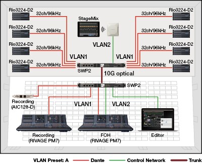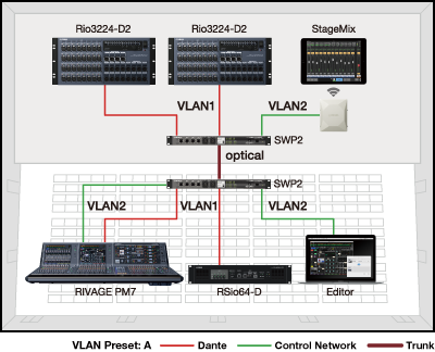 Dalam kasus ini VLAN Preset A digunakan, di mana VLAN1 menangani jaringan Dante sementara VLAN2 menangani sinyal kontrol seperti untuk Editor atau StageMix dari sinyal audio Dante, yang membuat jaringan lebih stabil.