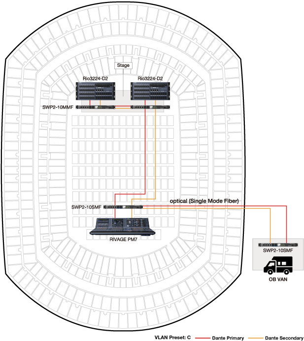 Dalam contoh ini, VLAN Preset C telah diatur pada switch SWP2-MMF dan SWP2-SMF, dengan jalur primary Dante ditetapkan ke VLAN1 dan jalur secondary ditetapkan ke VLAN2. Koneksi fiber optik single-mode antar switch memungkinkan transmisi data yang stabil hingga 10 kilometer.