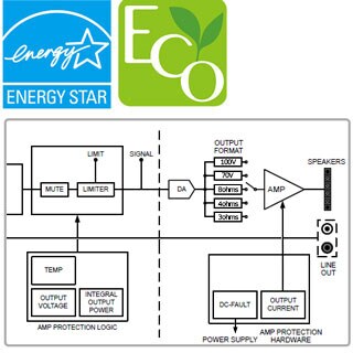 The MA2120 and PA2120 are both certified by ENERGY STAR,* the internationally recognized standard of energy efficiency accorded to environmentally friendly equipment. Both models feature an auto standby function that minimizes power consumption by automatically switching to standby mode when no audio input is detected for more than 25 minutes. Normal operation resumes as soon as audio input is detected. The energy-efficient MA/PA Series amplifiers are also certified as Yamaha Eco Products.**