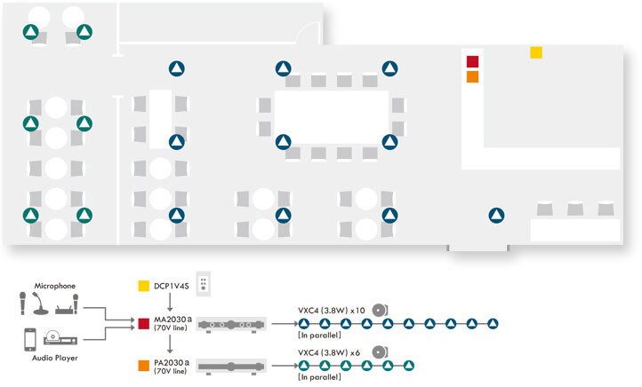This figure shows a system that would be ideal for a café, bar, or restaurant. Both the MA2030a and PA2030a are set to drive 70-volt lines, powering a total of sixteen VXC4 ceiling speakers in two zones via their 3.8W transformer taps. The MA2030a and PA2030a panel controls can be used for independent volume control in their respective zones, while a wall-mounted DCP1V4S control panel allows convenient adjustment of overall volume. Since the MA2030a accepts simultaneous input from audio players and microphones, this simple system can handle basic BGM for normal business as well as announcements and special events.