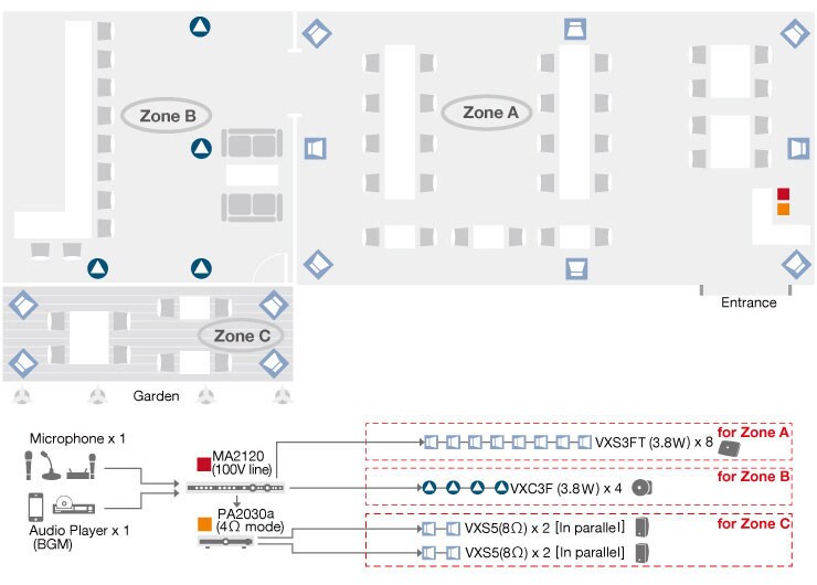 This figure shows a system that would be ideal for a restaurant with a bar and terrace area. The MA2120 is set to drive 100-volt lines, powering a total of 8 VXS3FT surface mount speakers via their 3.8W transformer taps, as well as 4 VXC3F ceiling speakers. The MA2120 can deliver different sources at different volumes in the respective zone. The PA2030a at 4Ω mode Lo-Z connection drives a total of 4 VXS5 surface mount speakers in parallel, delivering the same BGM at higher level.