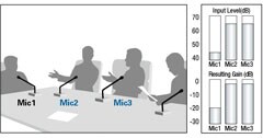 When one person is speaking the gain of that person’s microphone is instantly increased to 0dB while the gain of the remaining microphones is lowered. The same occurs when any other one person is speaking.