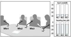If two people speak simultaneously the gain distribution between the active microphones is adjusted to achieve consistent overall gain, while the gain of the remaining microphone is lowered.