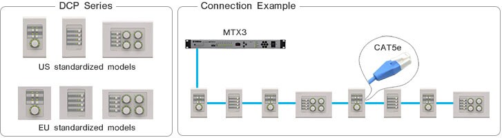 DCP controllers provide flexible external control of several functions such as preset recall, levels, and SD card playback. The series comprises of three different models that feature various configurations of switches and volume knobs. DCP controllers are connected to MTX/MRX series by using a daisy-chain connection up to eight control panels. All three models are available in either US or EU standardized sizes, built to meet the specifications of most regions around the globe.